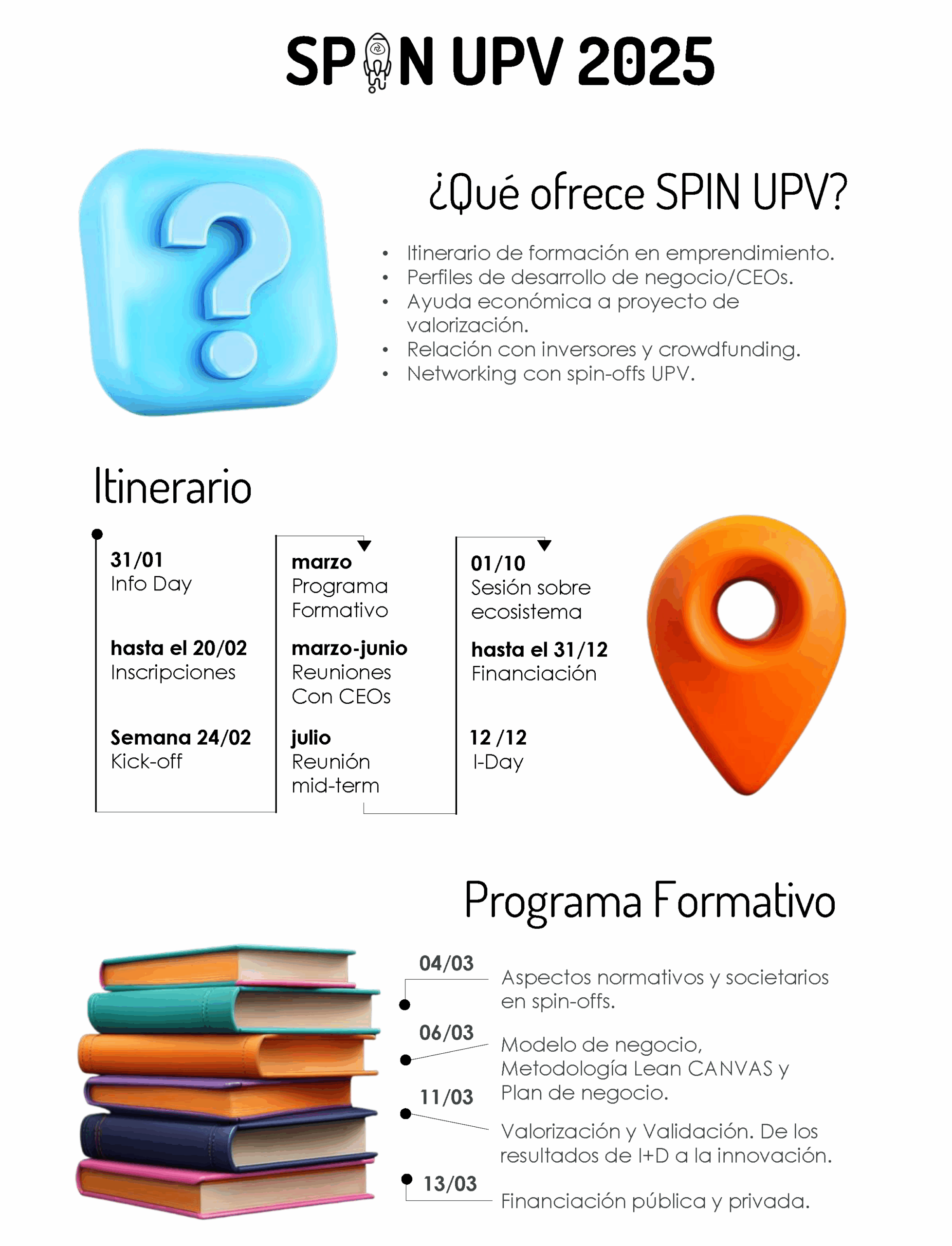 El programa contribuye a renovar el tejido económico de la Comunitat Valenciana. Para ello, SPIN UPV ofrece un itinerario de o sesiones de asesoramiento y formación que acompañarán durante el 2025 a los equipos de investigación que deseen transferir sus resultados científicos y tecnológicos a una empresa real con valor para el mercado y la sociedad.